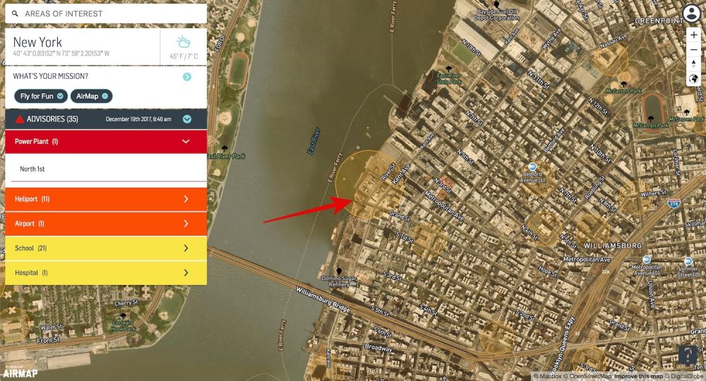Based on the video footage, Neistat seemed to be in the Grand Ferry Park in Brooklyn, NY and flew the drone mostly over the East River, away from people. This may indeed be safer (in some ways) than flying over the crowded streets in New York, but it does not seem to be away from any “potential dangers” as there is an NYPA gas turbine power plant right next to the park. Furthermore, as Airmap shows, there are heliports, schools, prisons, etc. in the area. Lastly, the location Neistat chose borders or may actually be part of the NY class B controlled airspace.