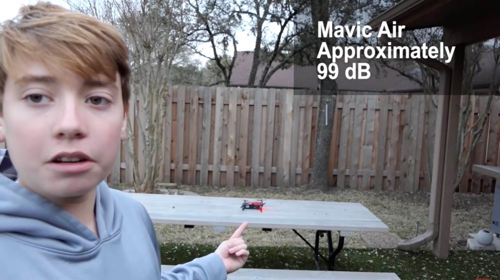 In another clip from Ready Set Drone, in which his son, Tate, seems to have made his YouTube debut, the noise levels between the three different DJI Mavic drones were compared. The tested the drones in a backyard environment and held the decibel meter about 6 inches below the front of the drone.
