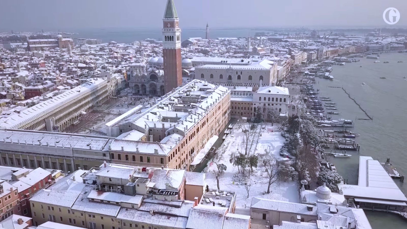 Some of Venice’s most famous landmarks are shown in the drone video, such as Piazza San Marco, Cannaregio and large parts of the city all covered in snow.