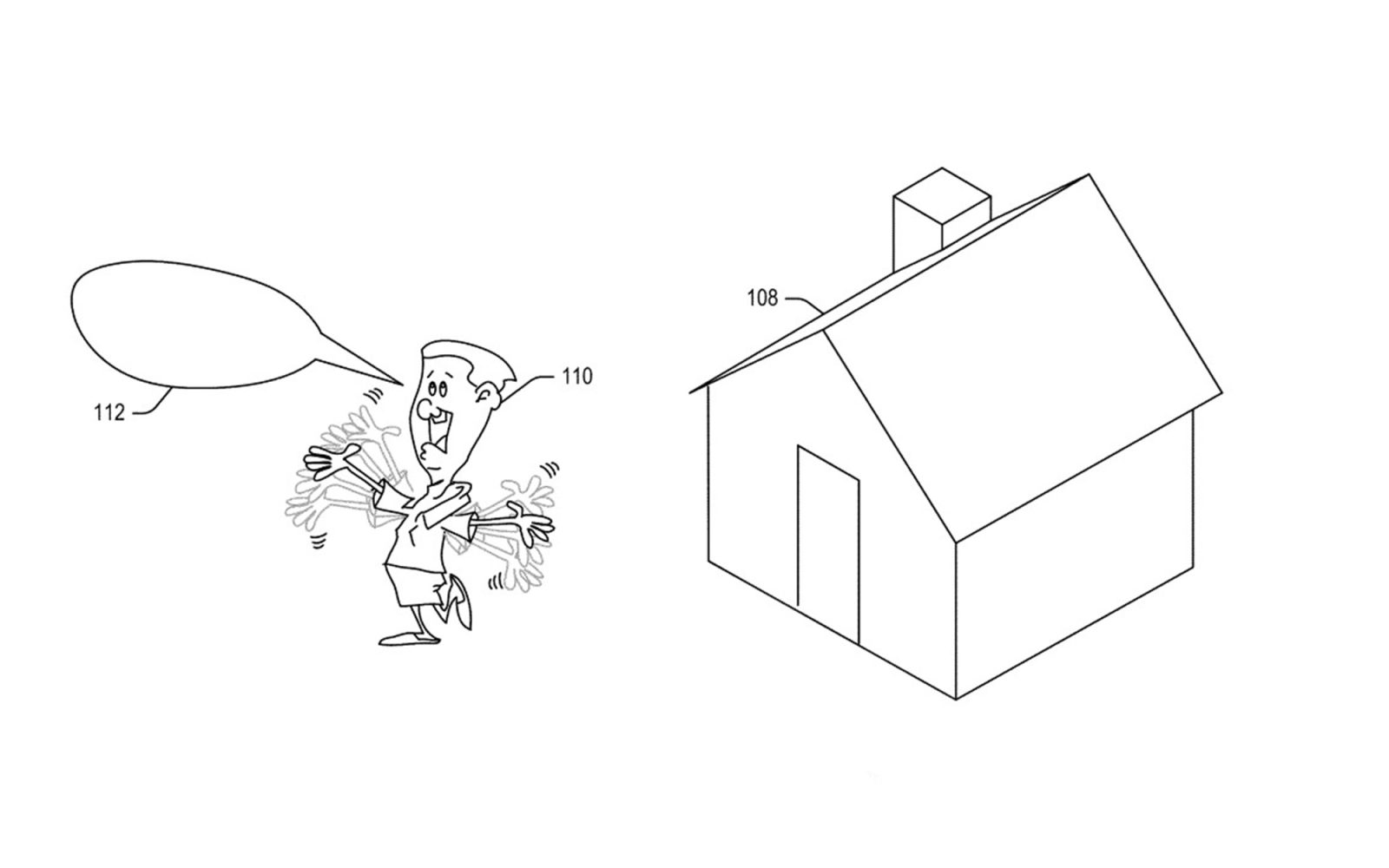 The patent includes several interesting illustrations. In one, a person is shown outside their house waving his arms in an “unwelcoming manner” accompanied with a voice bubble, indicating that the drone would be able to hear the person and possibly respond to the input. The patent reads: