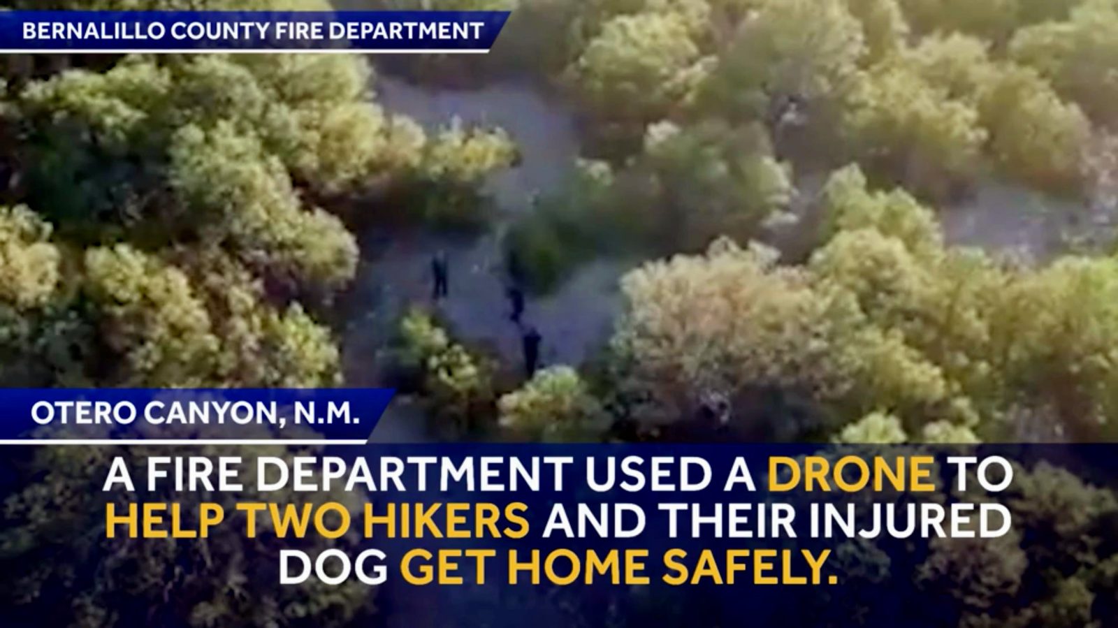 Two hikers and an injured dog had lost their way after five hours hiking in New Mexico Otero Canyon. Not knowing how to get back, they called 911 and asked for help. When the firefighters had located the hikers and were escorting them back to safety, they lost their way as well. At that moment a first responder used his personal drone to lead the group back to base.