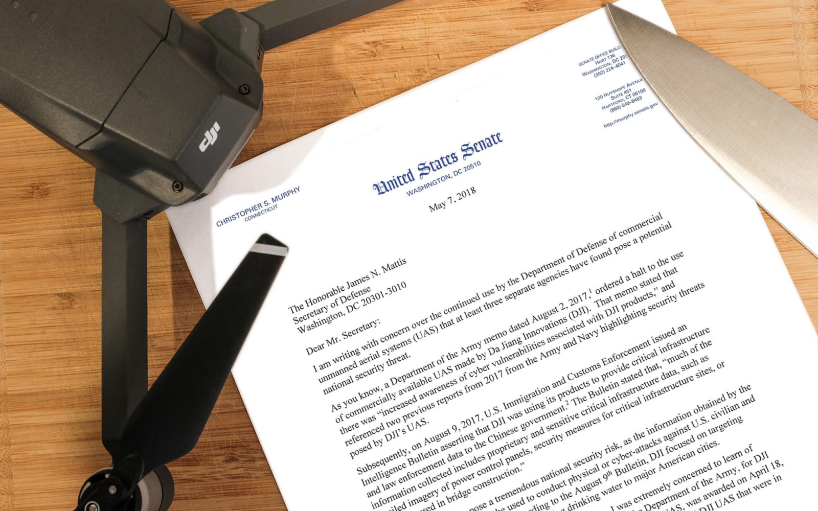 Today we learn that Junior Senator from Connecticut, Chris Murphy had sent a letter on May 7th, to the U.S. Secretary of Defense, James Mattis. Murphy expresses his concern over a recent solicitation, Benning375EMB00073, for 16 additional DJI drones, that was awarded on April 18, 2018. Murphy said that: