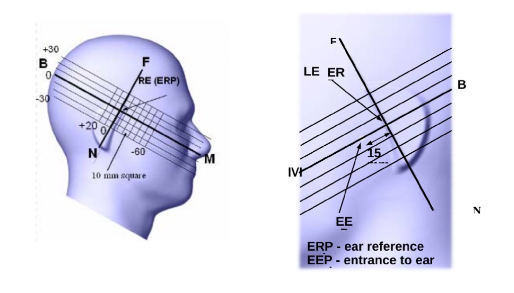 “This category includes most wireless handsets with fixed, retractable or internal antennas located toward the top half of the device, with or without a foldout, sliding or similar keypad cover. The handset should have its earpiece located within the upper ¼ of the device, either along the centerline or off-centered, as perceived by its users. This type of handset should be positioned in a normal operating position with the “test device reference point” located along the “vertical centerline” on the front of the device aligned to the “ear reference point”. The “test device reference point” should be located at the same level as the center of the earpiece region. The “vertical centerline” should bisect the front surface of the handset at its top and bottom edges. A “ear reference point” is located on the outer surface of the head phantom on each ear spacer. It is located 1.5 cm above the center of the ear canal entrance in the “phantom reference plane” defined by the three lines joining the center of each “ear reference point” (left and right) and the tip of the mouth.”