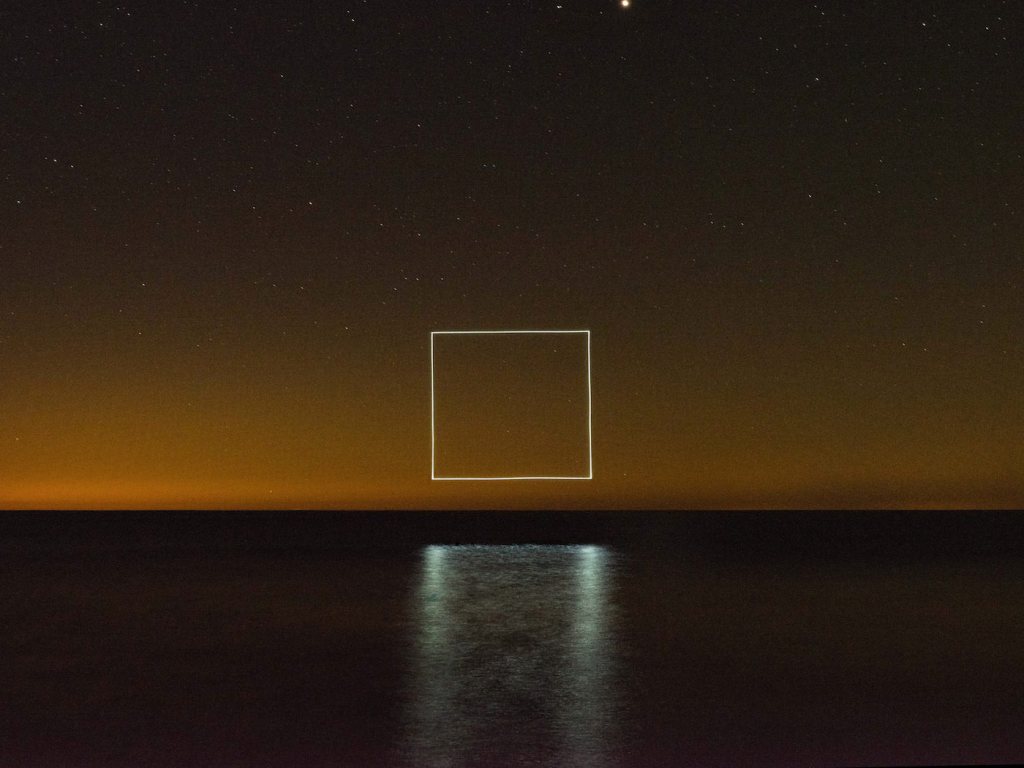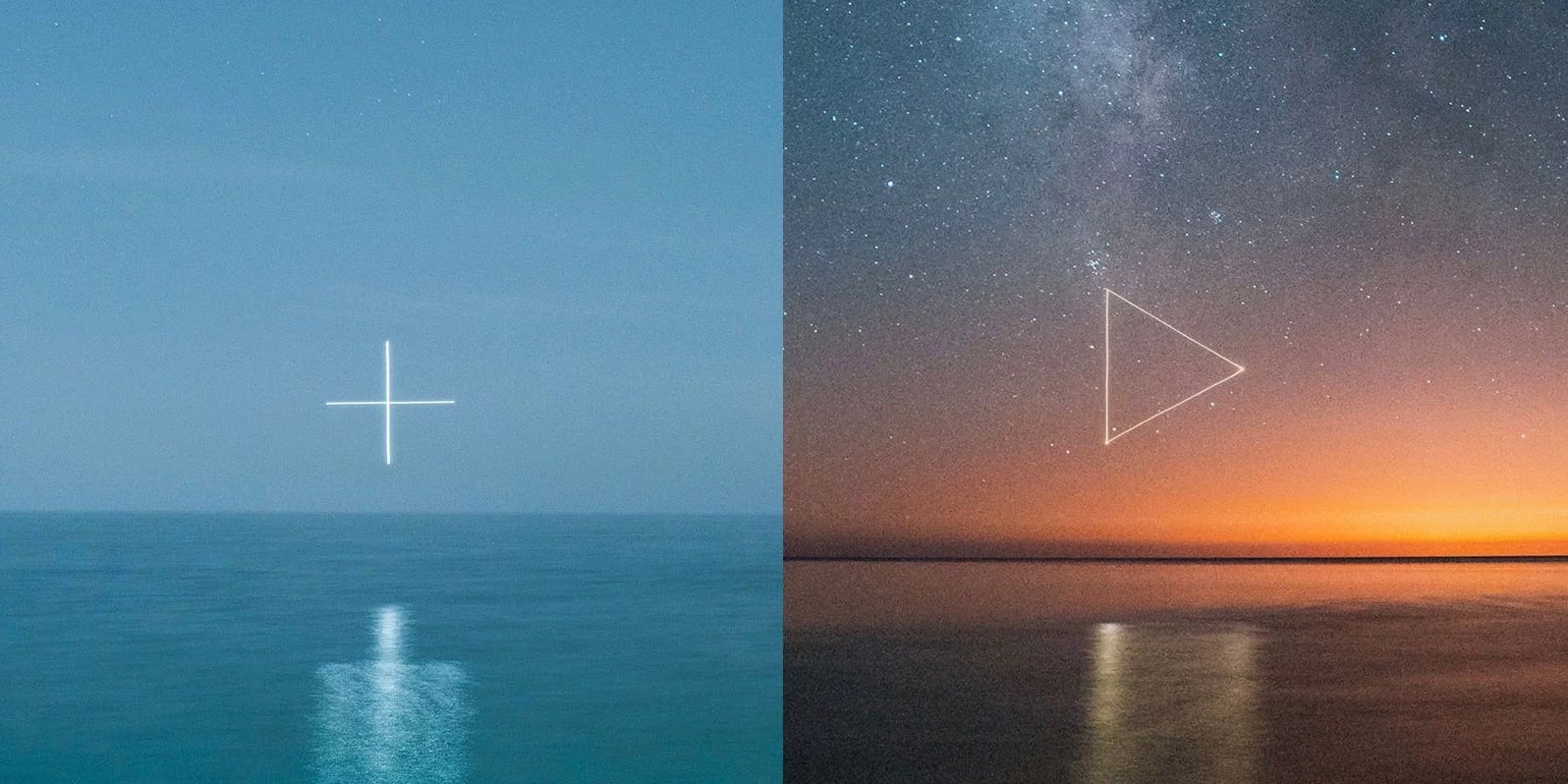 Reuben created the photos with the plus and minus symbols over the Pacific Ocean at night. The triangle and the square he shot above the water of Lake Michigan.
