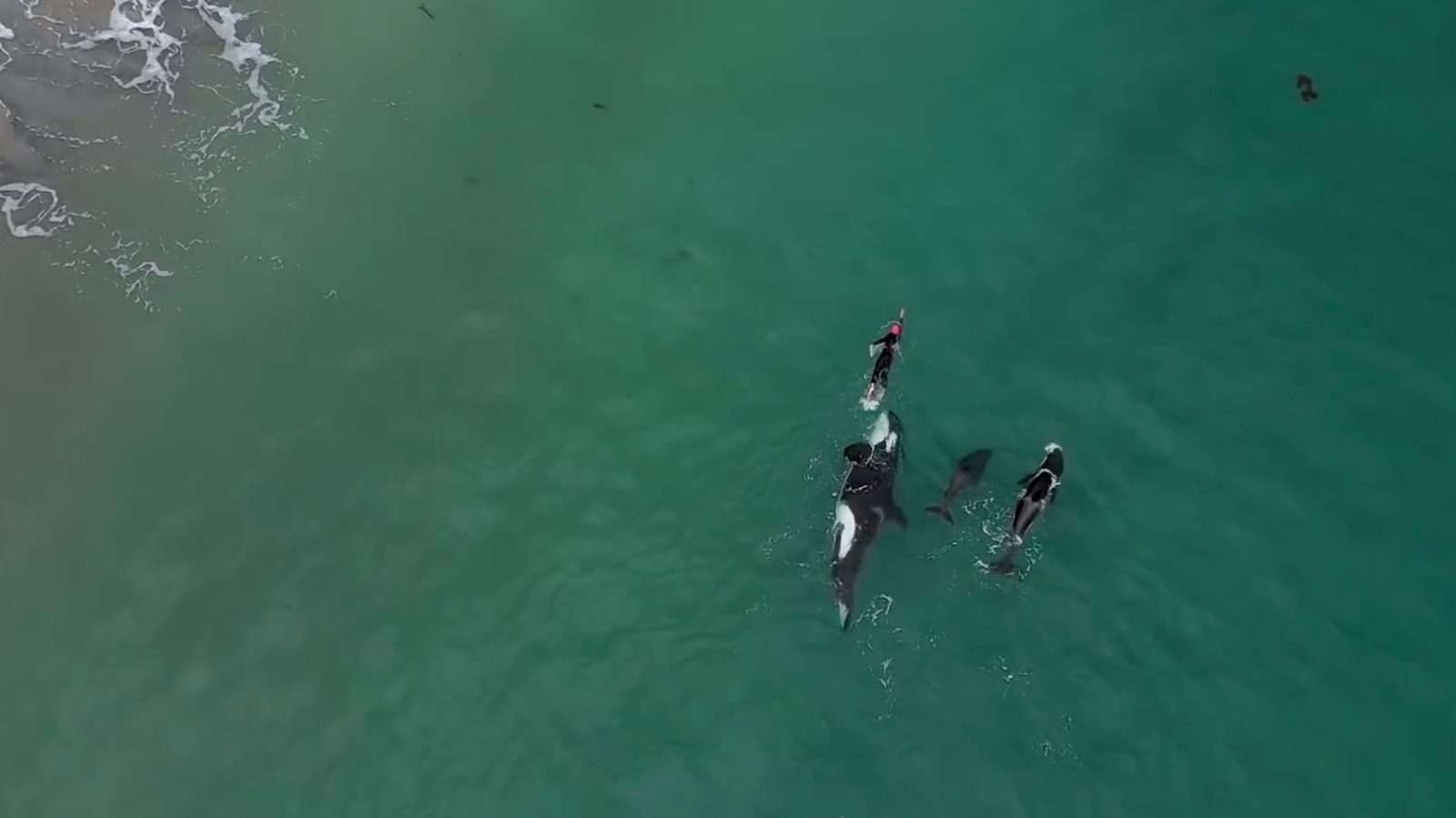 Killer whales join swimmer during workout