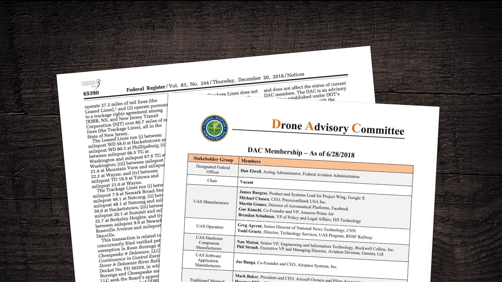 Current members of the FAA’s Drone Advisory Committee include industry people such as: Dan Elwell, Acting Administrator, FAA, James Burgess, Product and Systems Lead for Project Wing, Google X, Michael Chasen, CEO, PrecisionHawk USA Inc., Martin Gomez, Director of Aeronautical Platforms, Facebook, Gur Kimchi, Co-Founder and VP, Amazon Prime Air, Brendan Schulman, VP of Policy and Legal Affairs, DJI Technology and others.