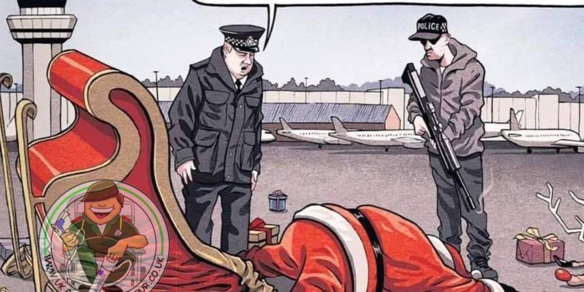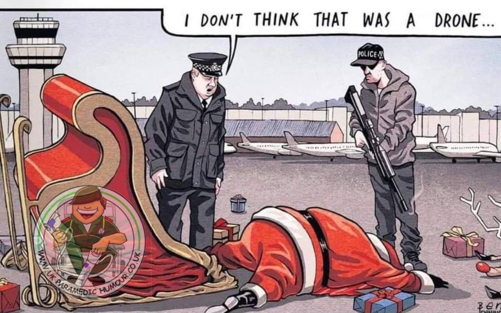 A cartoon perfectly sums up the Gatwick Airport fiasco. It was posted by UK Paramedic Humour on Facebook and it shows one police officer saying to the other policeman holding a smoking rifle: “I don’t think that was a drone…” as the two are looking down on a Santa and his crashed sleigh and reindeer. In the background, you can see Gatwick Airport.