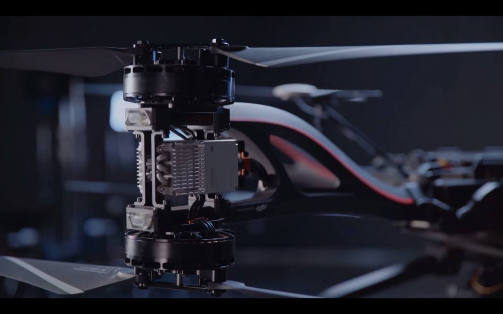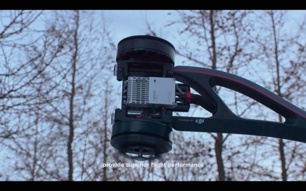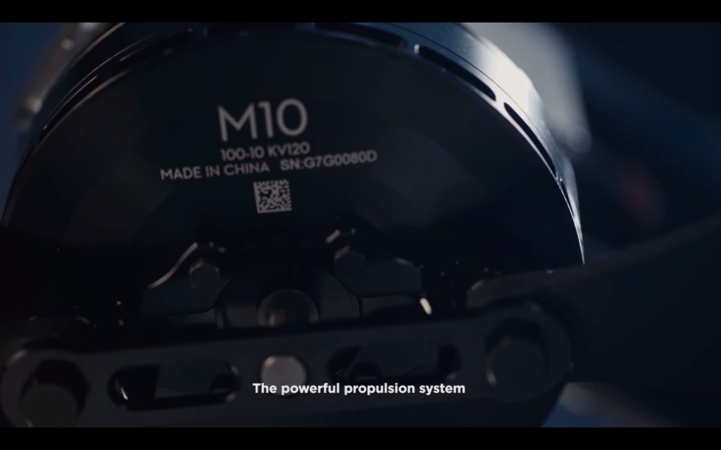 It has the Ronin-2 gimbal integrated. The landing gear of the drone consists of three non-retractable legs. On the motors, it says M10 100-10 KV120, Made in China and a serial number. And, powered by DJI Propulsion Laboratory.