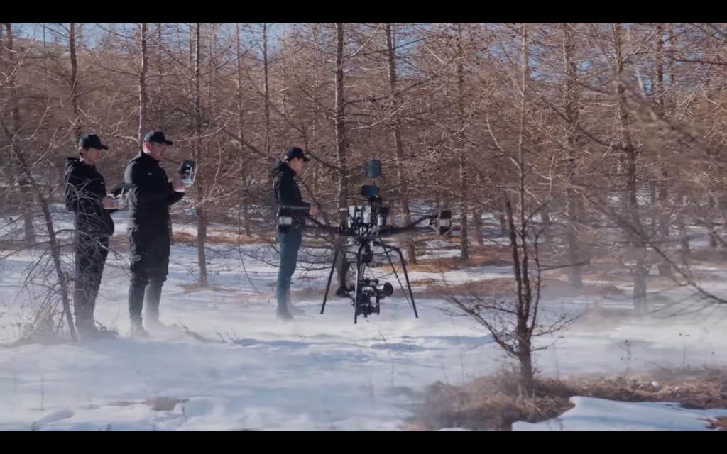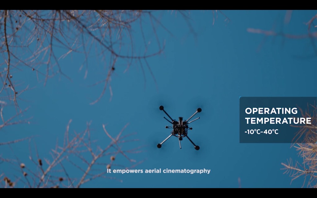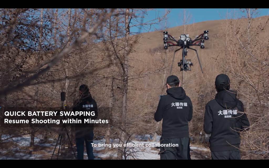 Anyway, let’s take a closer look at the DJI Storm drone. In the footage, you can see the words “Powered by DJI STUDIO” in the arms of the drone. It is an octocopter with four arms, designed to carry heavy loads. Its maximum payload capacity is 41 pounds. Think professional cinema cameras and lenses from brands like ARRI, Red, and others.