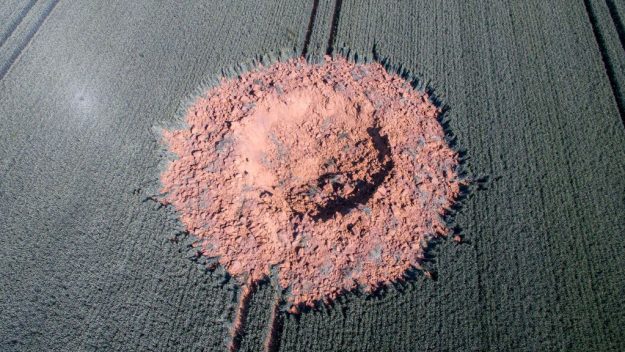 A drone photo shows a massive crater resulting from a bomb explosion in Germany. The crater is in a barley field near Ahlbach, Germany and according to experts is the result of a WWII bomb explosion that occurred on June 24 of this year. Officials say that the inexplicable explosion that shook residents of a central German town during the early morning hours last Sunday was “with almost absolute certainty” a World War II bomb. Drone photos later captured the crater that resulted from the nighttime explosion.
