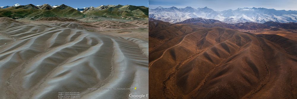 Simple of example of a scouted 3d location on Google Earth (left) and the drone result (right).