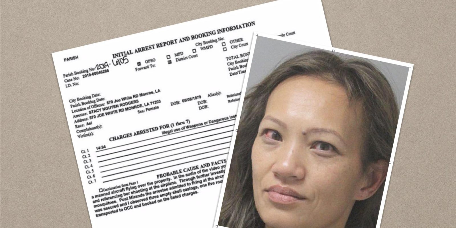 Stacy Nguyen Rodgers, 40, from Monroe, Louisiana, fired three shots at the small airplane trying to bring it down as it flew over her property.