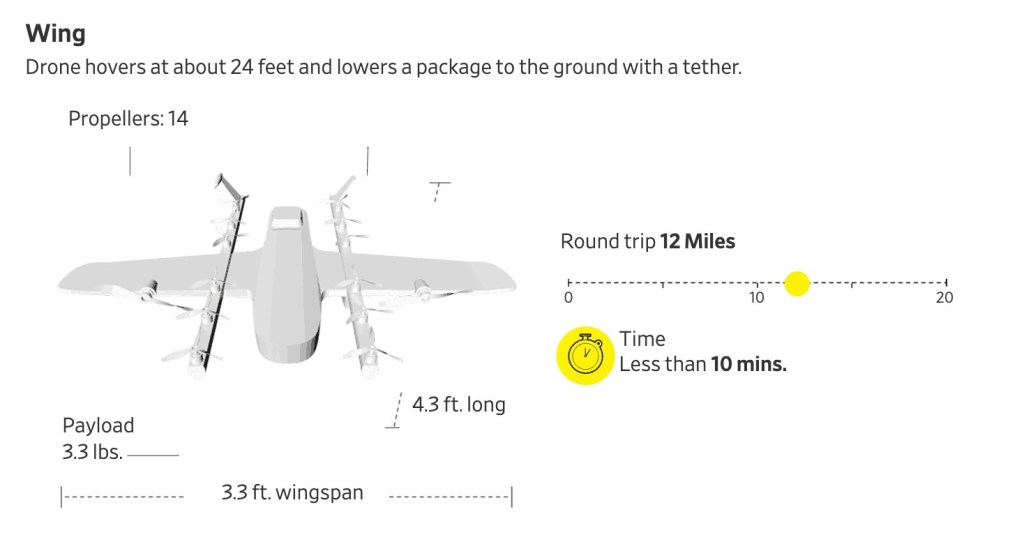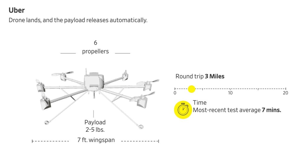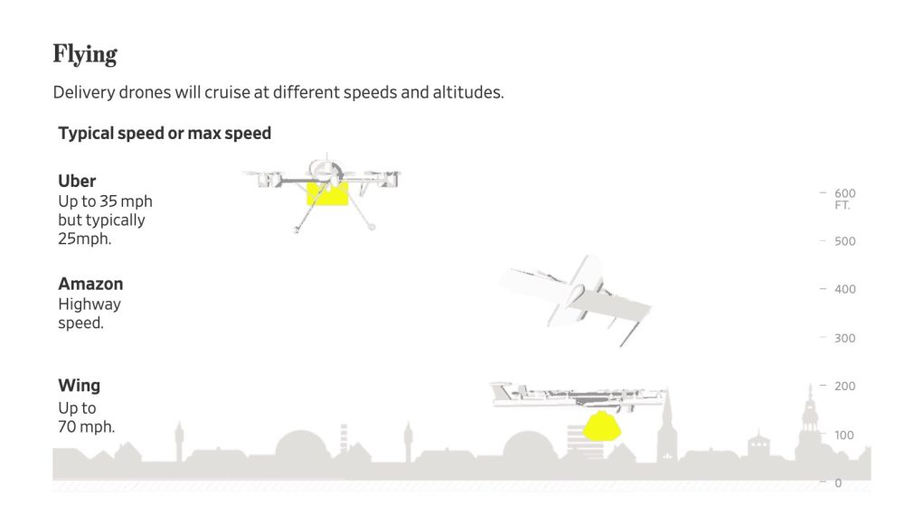 The Wall Street Journal article takes a closer look at the differences between the drones used by Amazon, Wing Aviation and Uber Technologies.