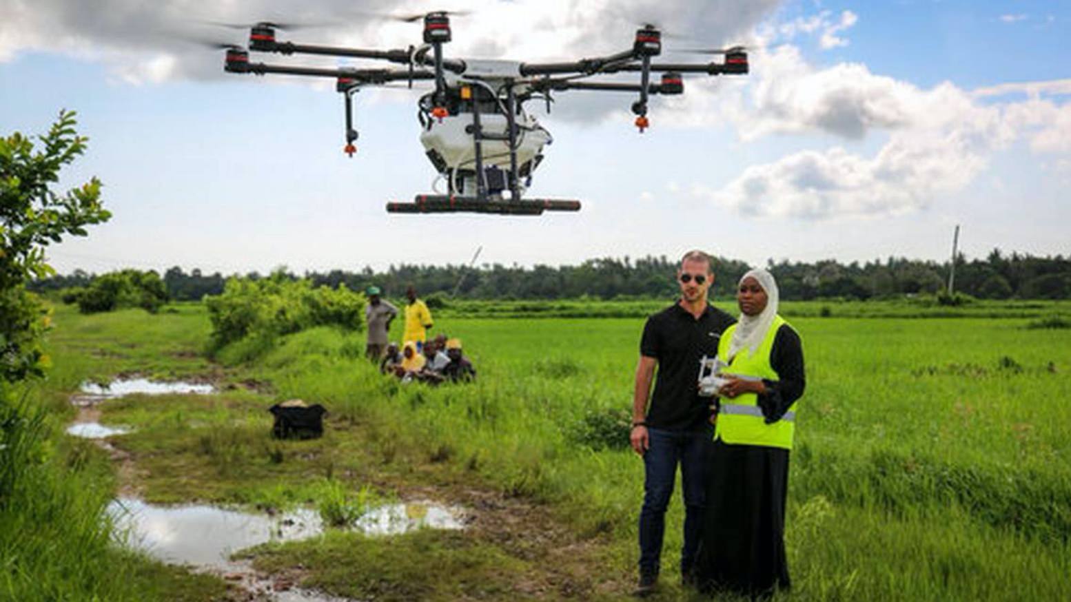 With the help of drone pilots from the State University of Zanzibar, the DJI Agras drone is being tested to spray the rice paddies.