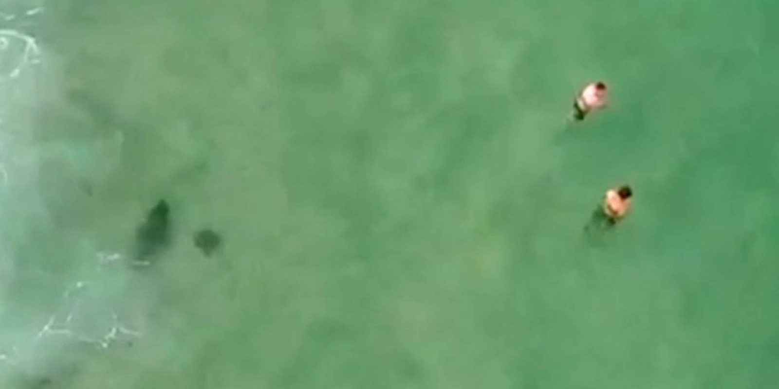 A pilot flying his drone over a popular New South Wales beach in Australia managed to spot a great white shark swimming within meters of two swimmers oblivious to the danger lurking nearby. Pilot Cameron Grace was flying his DJI Spark while on holiday from Sydney.