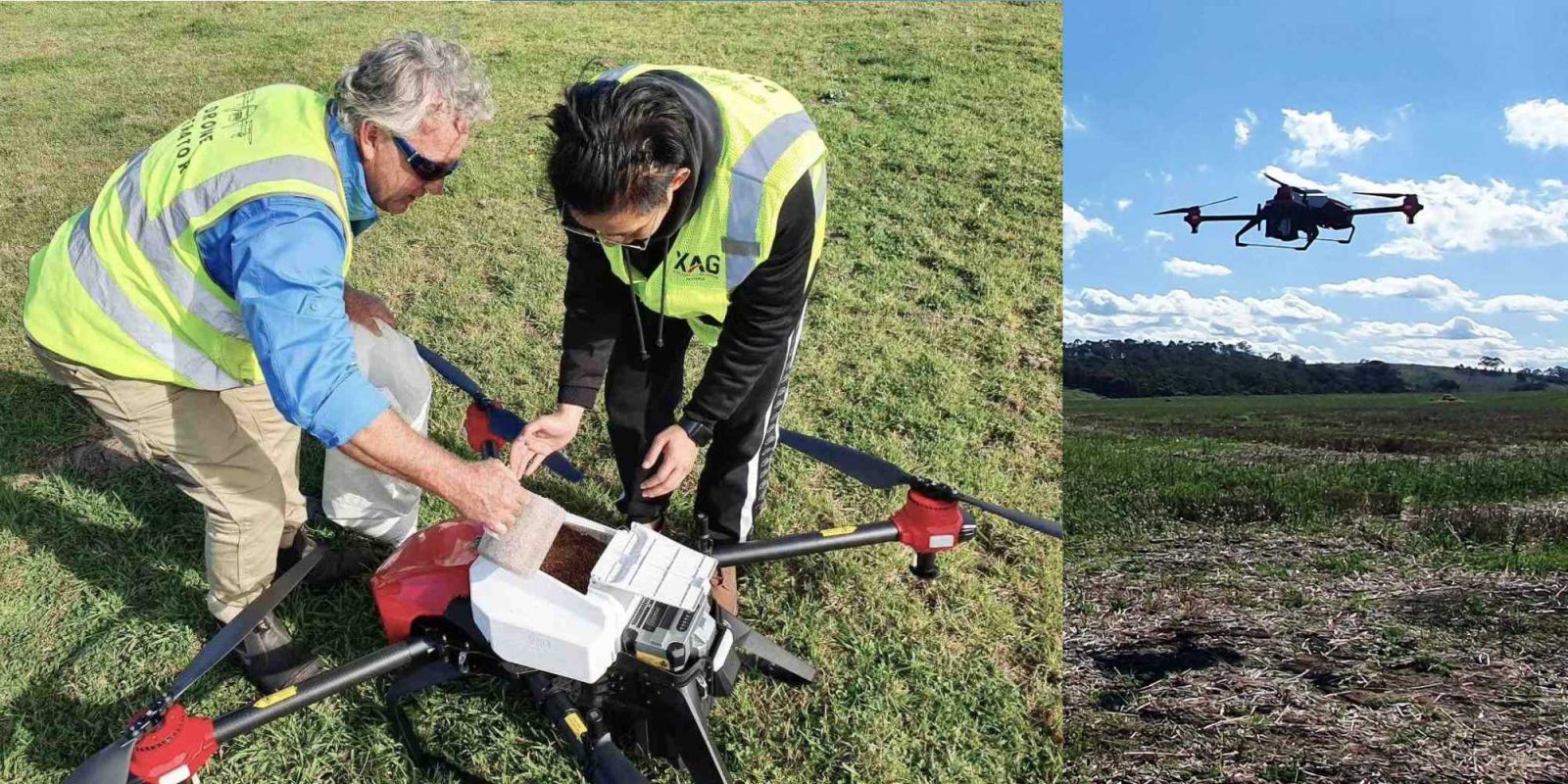 The drones follow a pre-set course, two to three meters above the ground. They use high-speed air to shoot seeds into the ground to ensure the perfect amount of seeds are distributed. XAG is also the first company approved by the Civil Aviation Safety Authority (CASA) to fly drones in swarms. Thus one pilot can fly up to five drones at once, further improving efficiency.