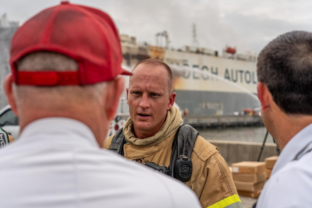 The M/V Hoegh Xiamen, used to transport cars and other machinery around the world, caught fire last Thursday after the ship was loaded. All crew managed to escape without injury. The fire crew fighting the fires, however, were injured by an explosion while putting the fire out, with three remaining in hospital.