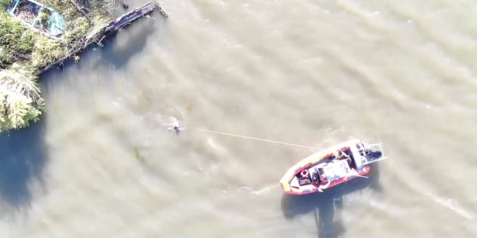 The drone follows the canoe with the daughter in it for a few seconds before watching over the father who is still in the water. The drone continues to monitor the father while he waited for the Contra Costa Fire department to arrive in its rescue boat. Within minutes the rescue boat arrived and picked up the man.