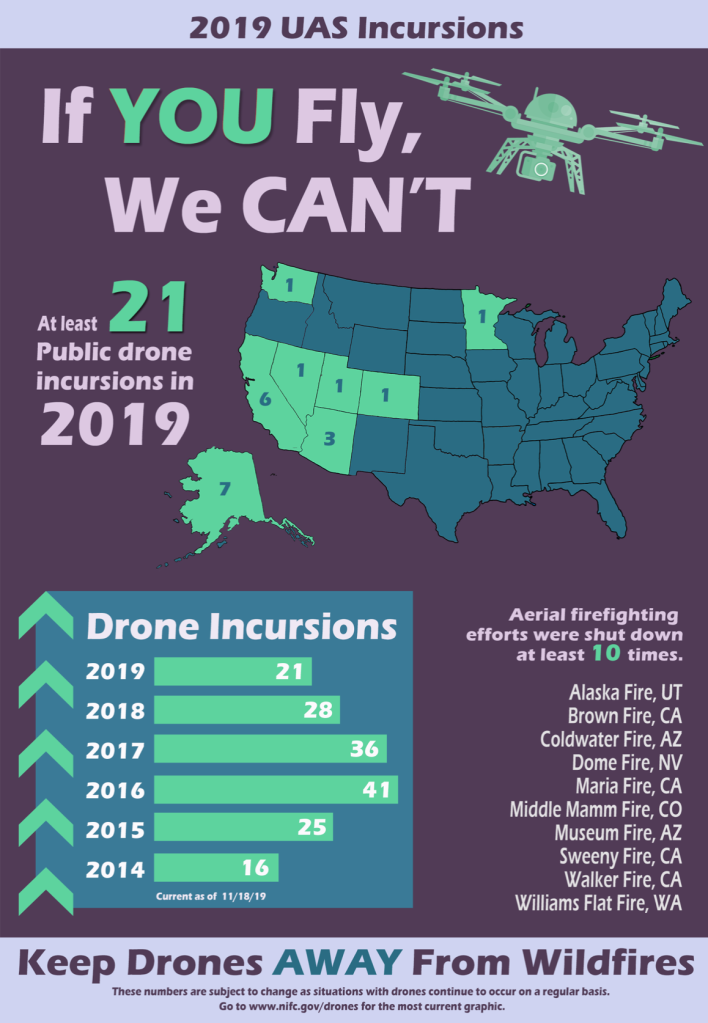 Flying a drone near a wildfire is dangerous and can cost lives. When people fly drones near wildfires, fire response agencies often ground their aircraft to avoid the potential for a midair collision. Delaying airborne response poses a threat to firefighters on the ground, residents and property in nearby communities, and it can allow wildfires to grow larger. Sadly, these incidents occur on a regular basis… Your photos and video footage of the wildfires are not worth the lives and crucial operations they jeopardize.