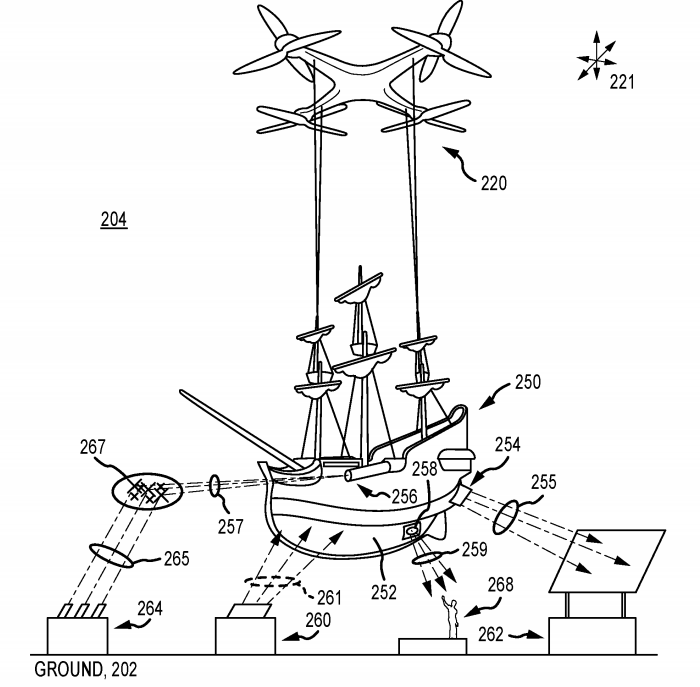 According to the patent’s abstract, the drones work with other drones and ground-based systems that all run through a central show control system. The central system tracks the UAVs in the show space to ensure they hit their mark and do what is required. The abstract gives the example of a drone lifting a battleship while using its downdraft to make the masks move in the wind, creating a more realistic effect.