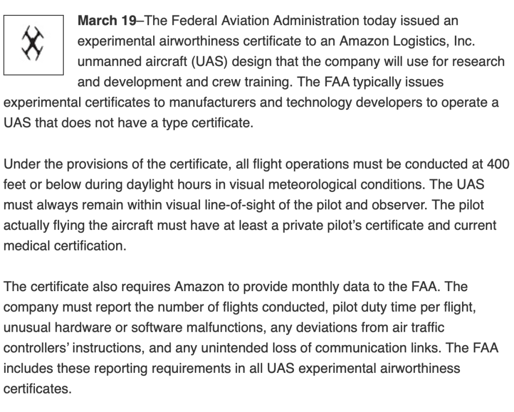 In 2015, as Amazon Prime Air pushed the ball forward, Amazon Logistics Inc. obtained an Experimental Airworthiness certificate from the FAA. That allowed them to continue tests:
