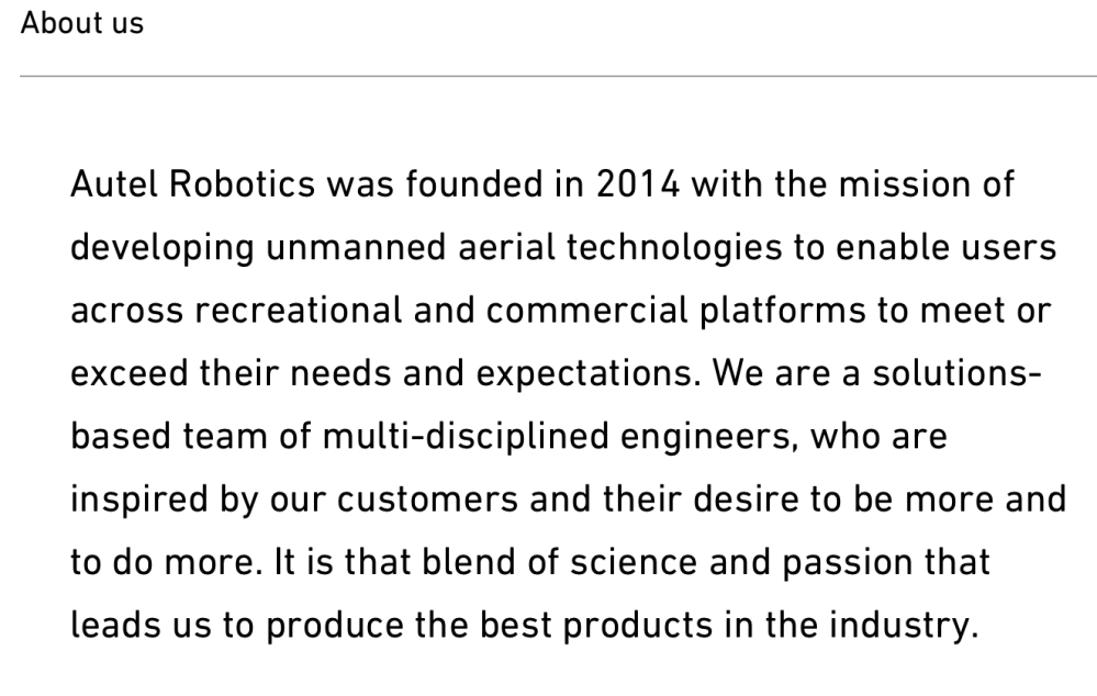 By carrying out the majority of assembly in the US, Autel is clearly seeking to change how its EVO II is viewed by the US government. As part of that, it’s been busy on its website. References to China, other than the option of reading the site in Chinese, are difficult to find. That’s despite the fact Autel is a subsidiary of Shenzhen Daotong Intelligent Aviation. On the “About Us” and “Contact Us” pages, one would be hard-pressed to discern this is a Chinese company. Here’s a screengrab: