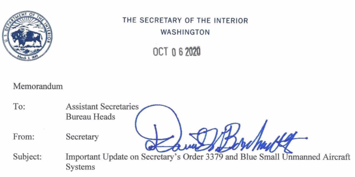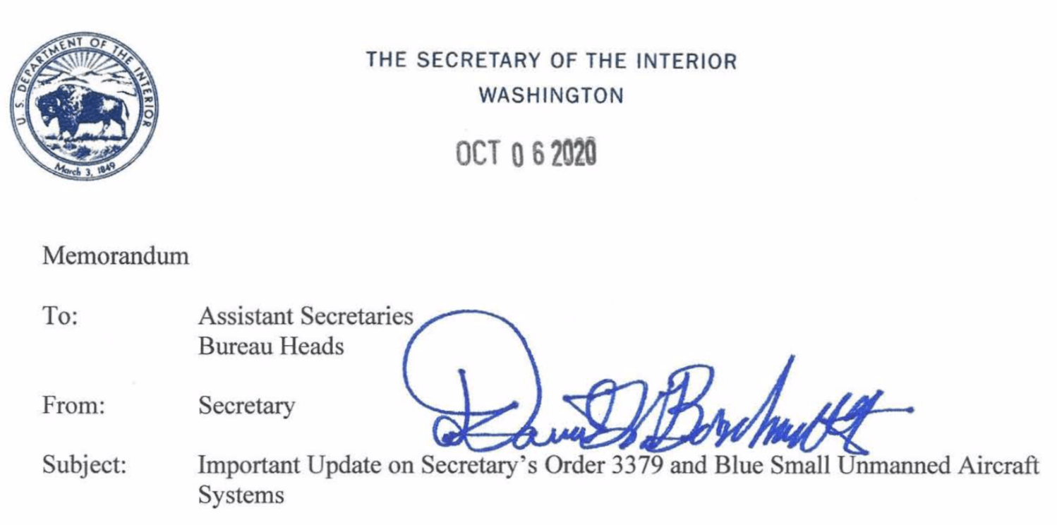 As the note indicates, the US Department of Defense has been working to create a list of what we might simply call “approved” drones. Bernhardt’s memo refers to these as “secure and trusted sUAS for Federal government operations.”