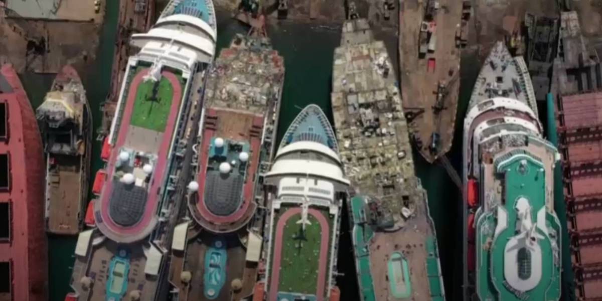 The video captured at a Turkish shipyard shows five cruise ships part way through being dismantled. The video was taken earlier this month at the shipyard in Aliaga, Turkey, west from the capital of Ankara.