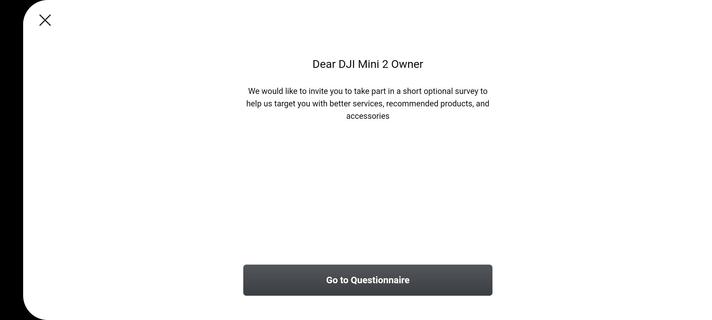 Upon opening the DJI Fly app after adding the newly released DJI Mini 2 to my account, a survey pop-up appeared. The pop-up is asking all Mini 2 users if they would like to take part in a short survey “to help us target you with better services, recommended products, and accessories.”