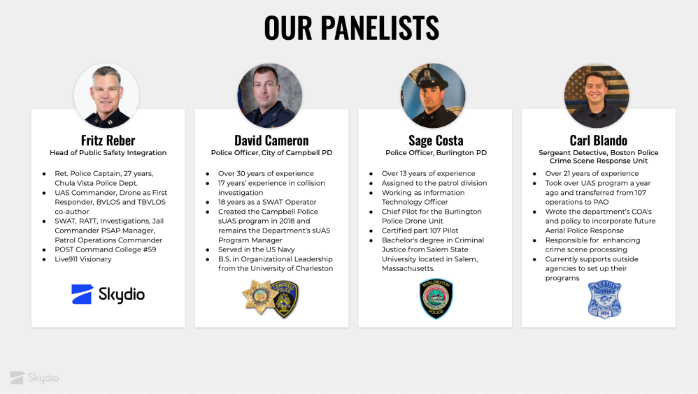 The three guest panelists have, collectively, 64 years of experience in law enforcement. And they’ve all had experience flying the Skydio 2 on the job. All of them praised the product, and each for different reasons.