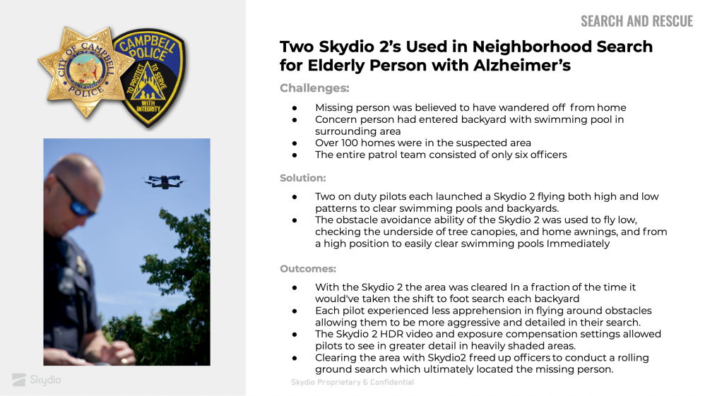 David Cameron is a police officer with the City of Campbell Police Department. He relayed the story of trying to find an elderly woman with a history of wandering. There are two Skydio 2s in its nine-aircraft fleet.