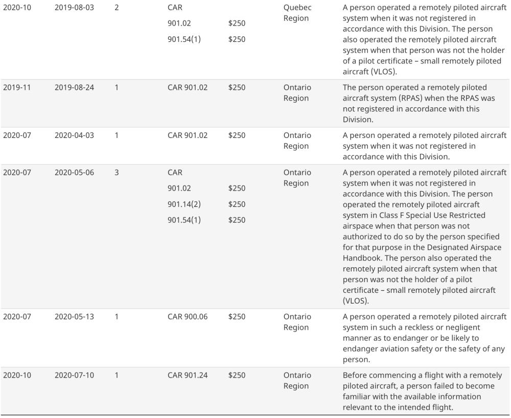 While it would be convenient to suggest that Canadians are really great at obeying regulations, we suspect the reality is that many more illegal flights take place that are simply never reported. There may also be many other cases where there was interaction with Transport Canada or law enforcement, but the incident ended with a warning rather than fines.