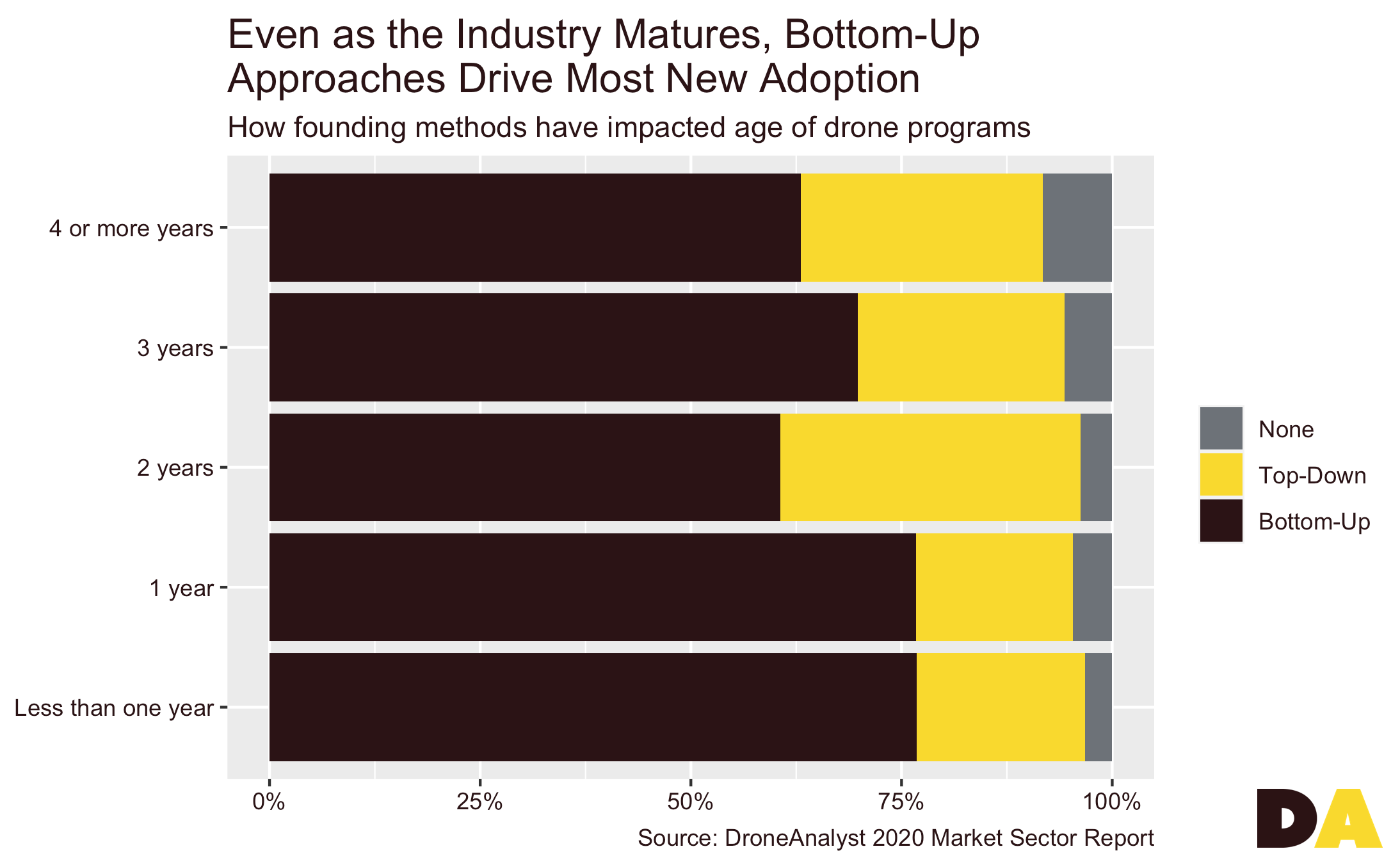 DroneAnalyst data also reveals that this trend has been ongoing. The majority of older drone programs – even programs that have been around for four or more years – were triggered by bottom-up approaches: