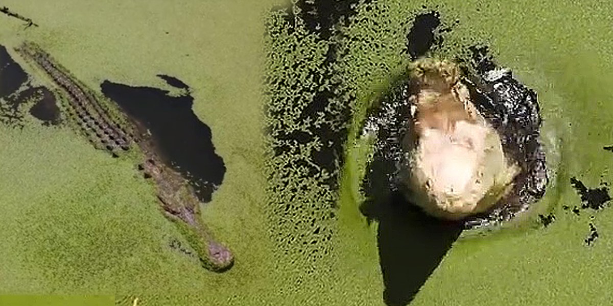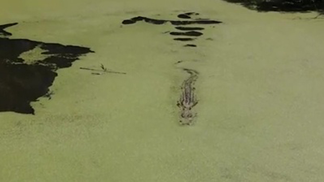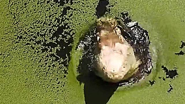 The video shows a number of the animals hiding just beneath some duckweed. But when the drone gets too close, they fling themselves out of the water, jaws wide open.