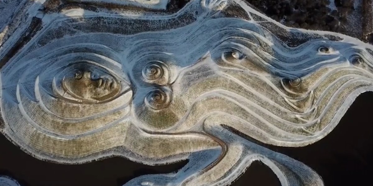 New drone video reveals the world’s largest nude female sculpture at least partially adorned this month. As seen from the air, snow gave the Lady of the North a dusting.
