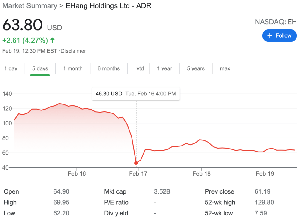 One report, and EHang stock started to plummet. Take a look at this five-day graph: