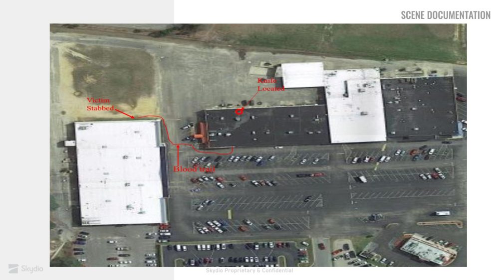 Keon popped up the Skydio 2 and started scanning the rooftop. It wasn’t long before he spotted the knife. Skydio’s 360° obstacle avoidance allowed him to confidently fly closer to the roof, despite the presence of HVAC equipment and other obstacles present. He also flew higher to get an overall picture of the scene that could be used for evidence.