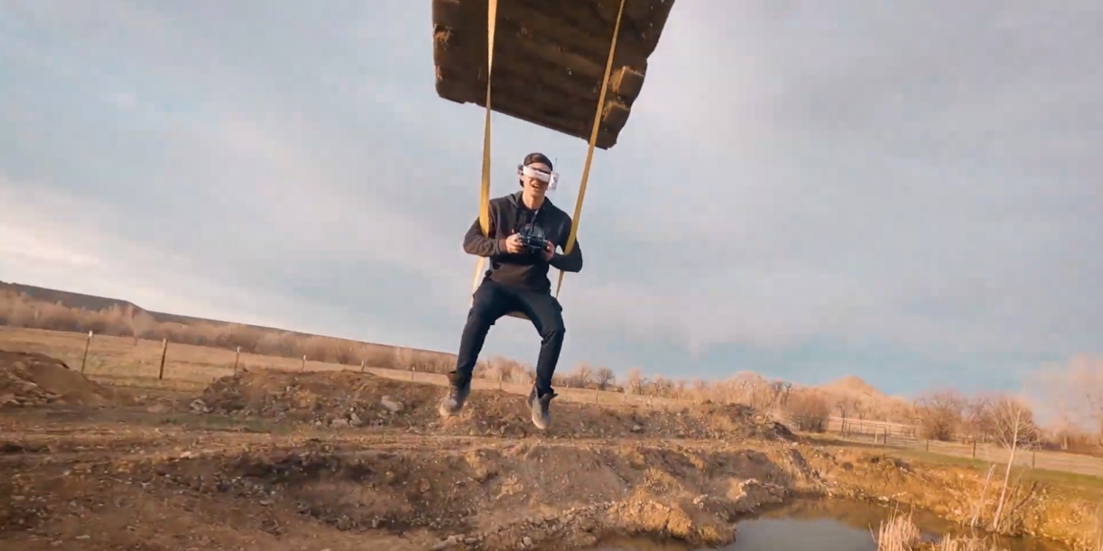 This was filmed at a friend’s farm near Boulder, CO. They needed some digging done and borrowed this excavator. My friend Colter Hoyt had the brilliant idea of setting up a swing on it and sent me a video of it. As soon as I saw it, I knew I had to film it! I didn’t actually plan on swinging with the goggles over my eyes. I was just going to keep them on my head because that’s sort of my brand image and how I take pictures. But once I sat down on the swing, I realized that flying a drone while swinging would be totally possible.
