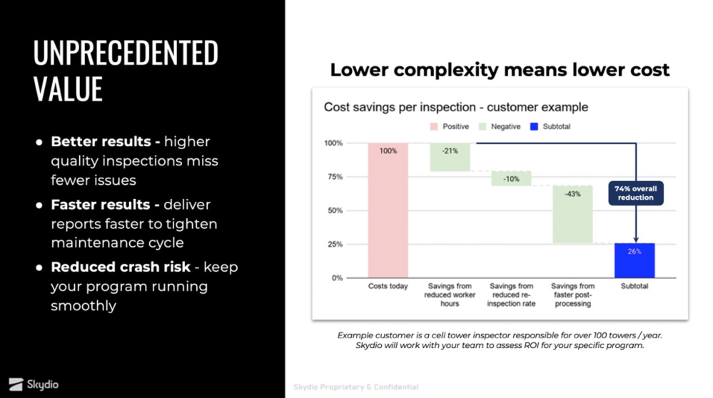 The original slide for this contains a GIF. Normally, you’d see how a Skydio drone scopes out what’s in that volume and plans its shots in that bottom left slot. This is definitely not a standard lawnmower-pattern grid. The drone figures out what it is you want defined, then calculates the necessary flight path to capture all the contours – and the data. And then…it simply does it.