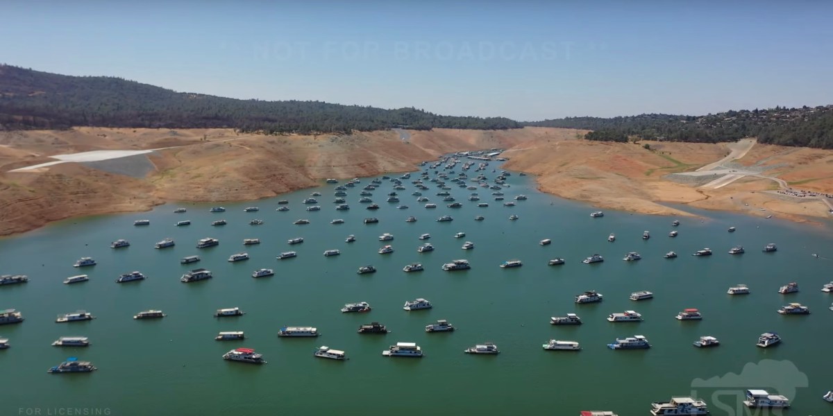 Revealed in Clement’s footage are steep slopes of Lake Oroville’s shores, marked by tiers and varying colors indicating higher water levels; the bare, sandy bottom of the reservoir already looking like an arid moonscape; and groups of boats anchored tightly together in the only areas of the lake still deep enough to accommodate them.