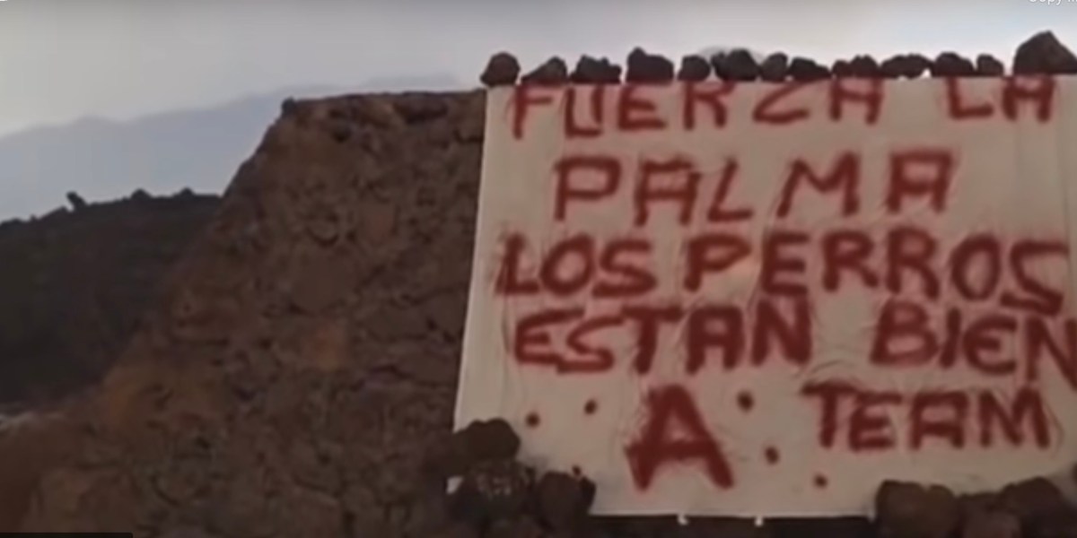It then cuts to a spray-painted banner draped on a wall reading, “Be strong La Palma, the dogs are well: A-Team.” It continues on for a minute with still shots of emaciated dogs behind the message, “Cheer up! We are in La Palma.” A final section flashes slogans of encouragement to the island’s volcanically fatigued residents.