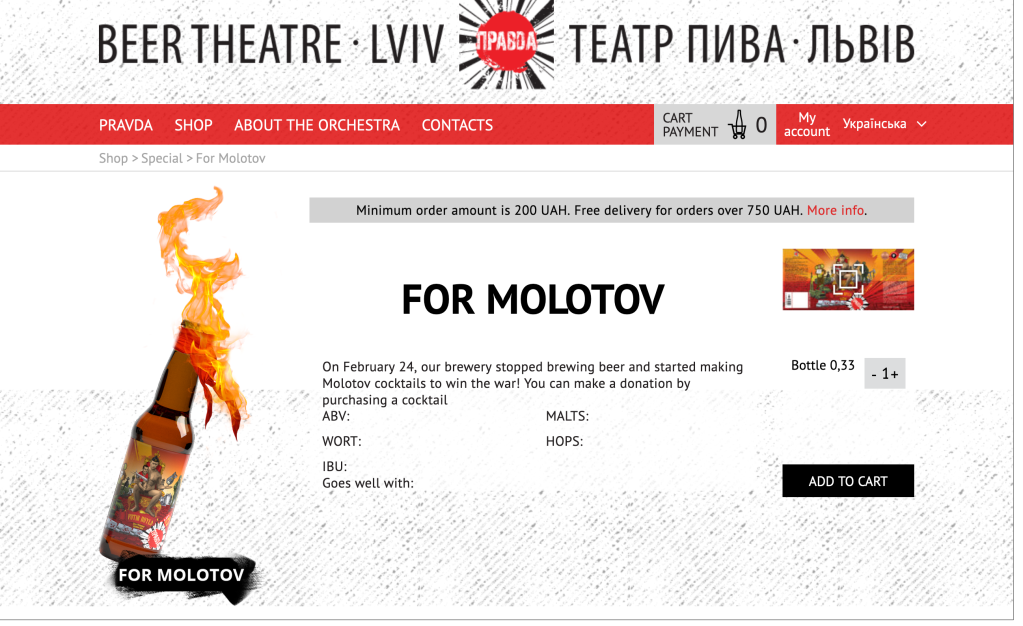 “On February 24, our brewery stopped brewing beer and started making Molotov cocktails to win the war!” Pravda’s “For Molotov!” product web page informs browsing customers “You can make a donation by purchasing a cocktail.”
