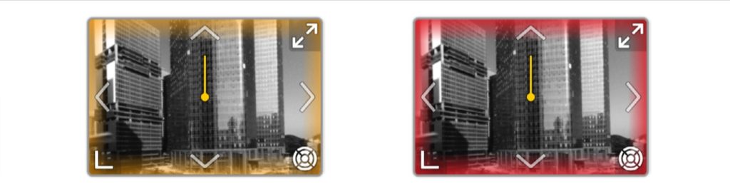 When an obstacle in the current view direction is detected, Vision Assist will show you a collision warning. The color of the warning is determined by the distance between the obstacle and the aircraft. A yellow warning means that the distance between the aircraft and the obstacle is between 2.2 and 5 meters. On the other hand, if the obstacle is less than 2.2 meters away from the drone, a red warning will show. Do note that this warning will appear only when Vision Assist is being displayed in the small window.