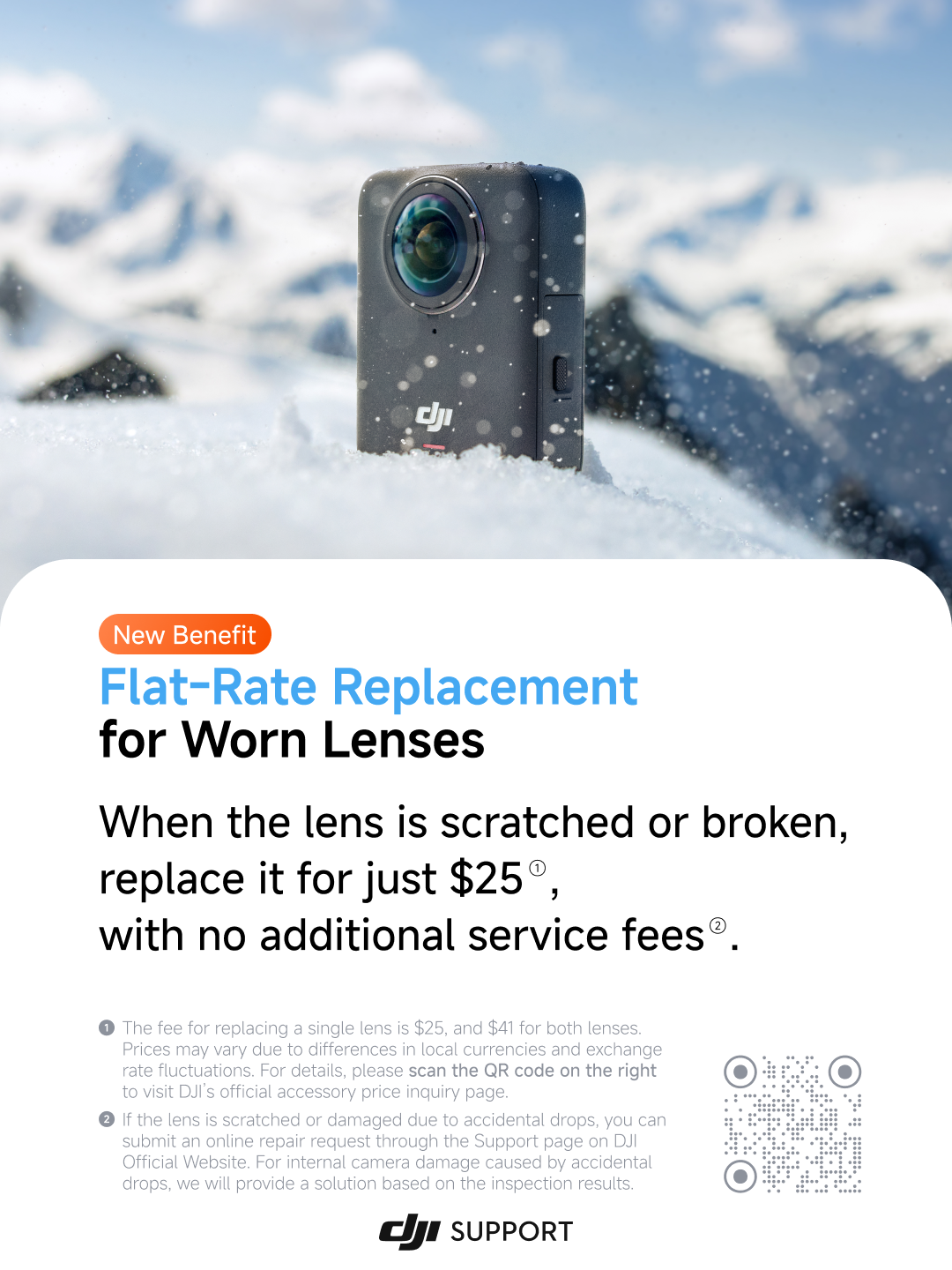 For added peace of mind, DJI offers a flat-rate lens replacement program. Scratched or broken lenses can be swapped for $25 each or $41 for both. Users simply submit a repair request online, and DJI will handle the fix — even evaluating internal damage from accidental drops.
